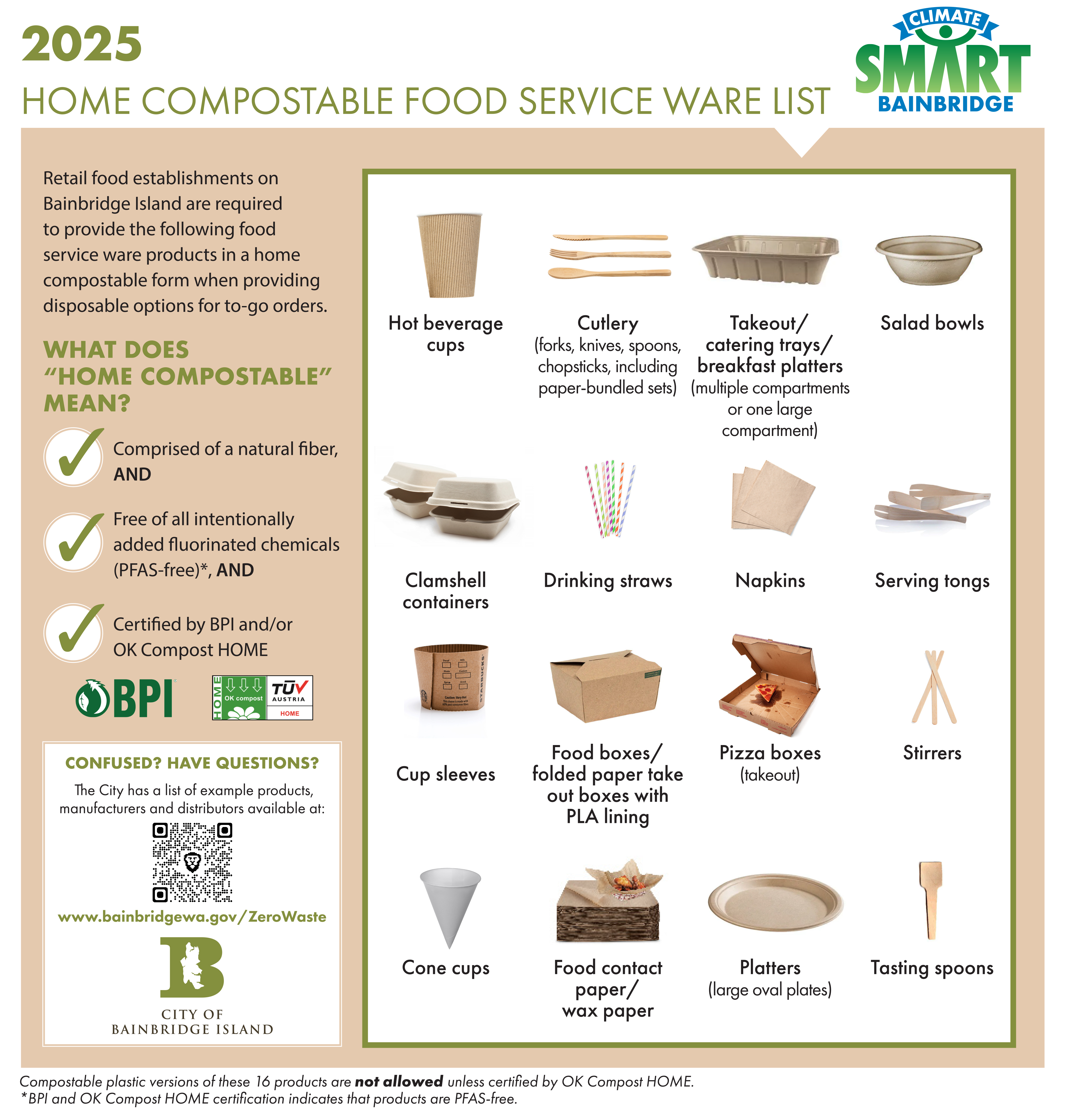 - Any other disposable food service ware items must be certified by BPI and/or OK Compost HOME, and/or accepted for recycling by Bainbridge Disposal.